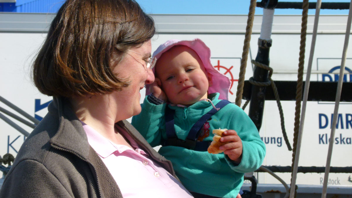 ![]() Gleich nach dem Einlaufen kam der nächste seemännische Nachwuchs an Bord. Noch mit Semmel in der Hand auf Wache, aber schon mit Lifebelt. |